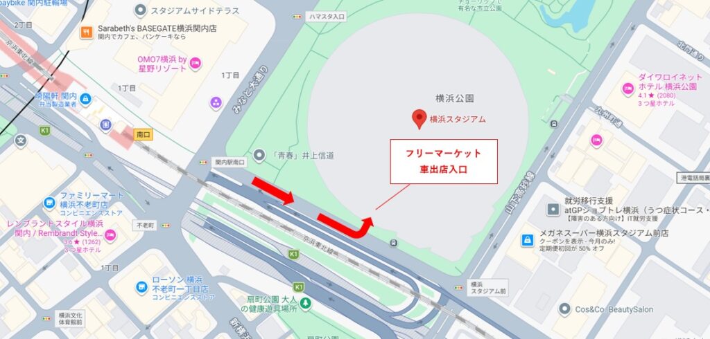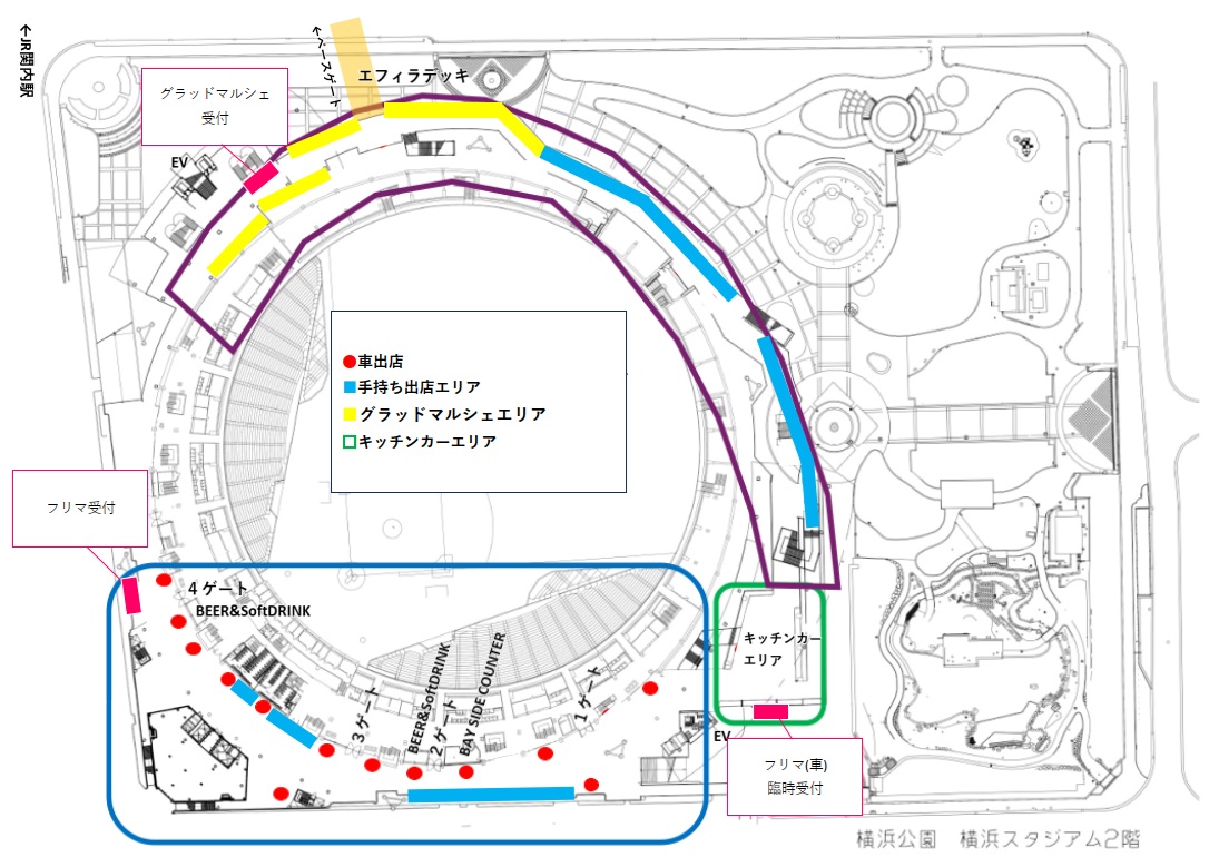 1️⃣車出店をお申し込みの方は、「関内駅南口」から「横浜スタジアム前」へ進む途中左手の入口へ入場してください。係員の指示通り進みますと開催本部へ着きますので受付を完了させて下さい。